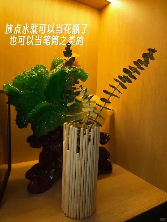 之后把它用热熔胶粘贴在矿泉水瓶外边,这样就可以放在家里用来当做花瓶,颜值也很高,立马变成了一件美美的艺术品,除了可以用来当花瓶以外,还可以用来当笔筒。