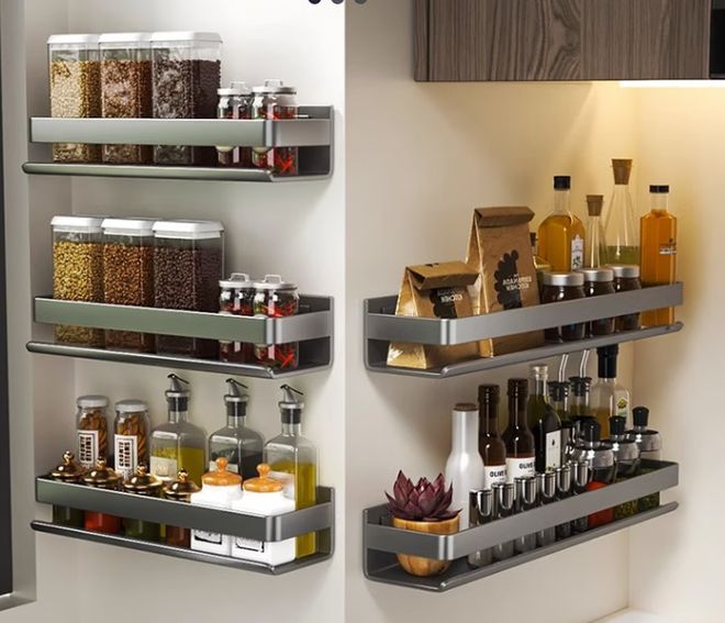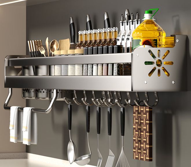 另外,挂钩式置物架也很实用。它可以把常用的餐具、锅铲挂在墙上,不仅方便取用,还能释放台面空间,打造整洁的厨房环境。